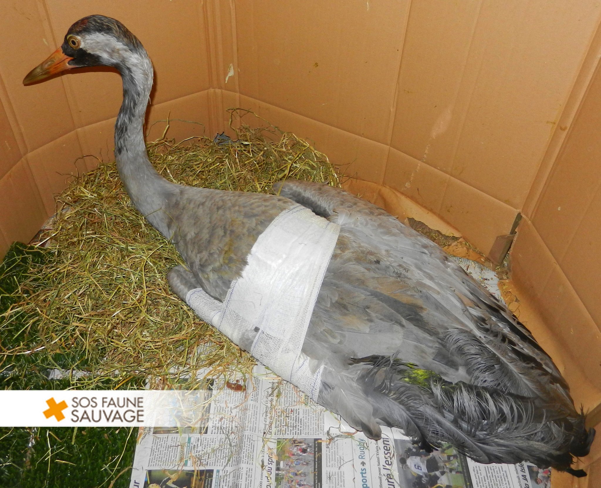 Pour le moment, une contention a été pratiquée sur notre oiseau, d’une part pour que la consolidation osseuse permette de garder un minimum de fonctionnalité sur l’aile, et d’autre part pour soulager la douleur due au poids de l’aile pendante. Après avoir passé 15 jours d’observation en infirmière, la jeune grue est aujourd’hui en volière et elle s’habitue à se mouvoir avec son handicap.