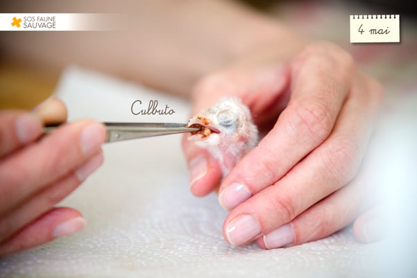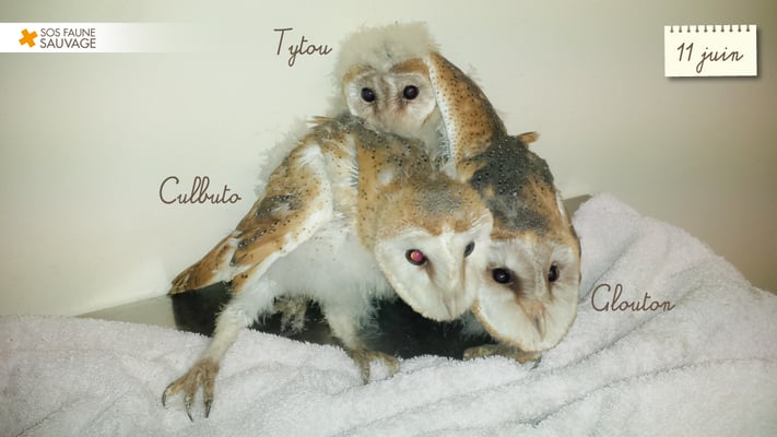 Voici leur histoire : dérangé lors de travaux dans une grange, le nid nous a été amené avec 7 œufs. Sans perdre une minute, nous les avons immédiatement mis en couveuse. Le premier œuf a éclos le 1er mai, le second, le jour d’après et le dernier le 8 mai (seulement 3 œufs ont éclos, les autres n’ayant pas été fécondés). Sont sortis des poussins d’une grande fragilité, qu'il a fallu placer de suite dans une éleveuse pour contrôler la chaleur et l’hygrométrie (2 paramètres essentiels au bon développement des oisillons). Après plusieurs semaines de soins, ces petits cœurs ont rejoint l’infirmerie avec d’autres effraies… premier contact réussi avec des congénères.